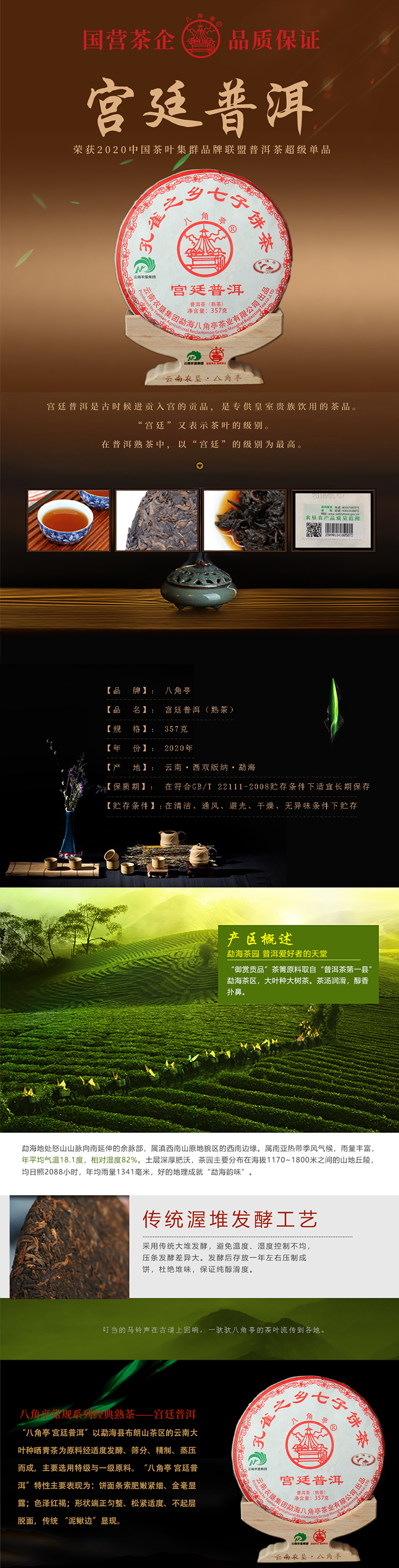 云墾茶業(yè)集團下屬茶葉生產(chǎn)企業(yè)——云南農(nóng)墾集團勐海八角亭茶業(yè)有限公司原名黎明茶廠,是我國歷史最為悠久的茶企之一,曾位列“中國普洱茶十大知名品牌”“十大最受歡迎茶葉品牌”、“中國普洱茶十大暢銷品牌”中,成為今天市場上最有影響力的品牌之一。公司產(chǎn)品獲得“綠色食品”、ISO9001、 HACCP和云茶品牌(YC)4項認證,連續(xù)獲得“云南名牌農(nóng)產(chǎn)品”“云南名牌產(chǎn)品”“云南省著名商標”等品牌榮譽,公司生產(chǎn)的多款普洱茶在歷次專業(yè)評比中多次獲得特等金獎和金獎。在2018第五屆中國企業(yè)五星品牌論壇上,云南農(nóng)墾集團勐海八角亭茶業(yè)有限公司上榜中國普洱茶行業(yè)影響力品牌——“金芽獎”,公司負責(zé)人陳勝軍先生獲“陸羽獎”,被授予2017“國際十大杰出茶人”榮譽稱號。