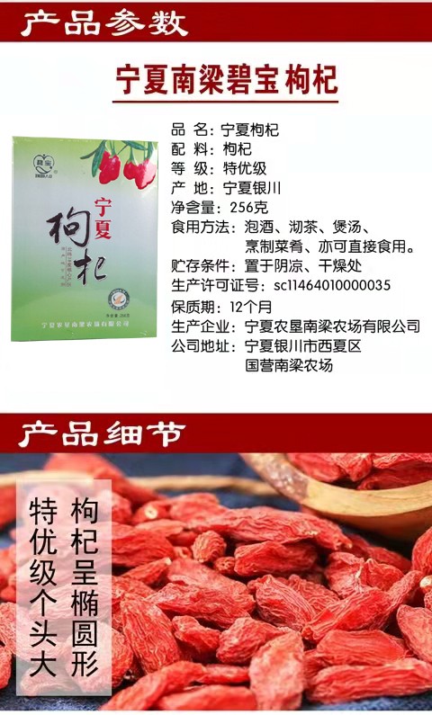 寧夏農墾南梁農場有限公司成立于1992年10月,隸屬于寧夏農墾集團有限公司,是集科研、開發、種植、生產、加工、銷售為一體的自治區級農業產業化龍頭企業。南梁枸杞已有50多年的栽培歷史,所產枸杞以粒大、肉厚、籽少、味甜、藥效高而享譽全國。 南梁農場枸杞基地先后被國家、自治區確立為“萬畝優質富硒枸杞生產基地”,“農業部無公害農產品示范基地農場”,“全國農業標準化示范基地”,“自治區農業產業化重點龍頭企業”等稱號。公司主要產品為“碧寶牌” SOD富硒枸杞、“南梁”牌枸杞。主導產品“碧寶牌” SOD富硒枸杞獲得國家專利和綠色食品證書,多次獲得中國農業博覽會金獎、馬來西亞國際金獎、兩屆中國專利新技術新產品博覽會金獎在內的多項國際國內金獎。